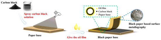 Figure 1 shows the preparation process of black paper base. Thus, 150 mL of deionized water was added to 1.5 g of water-soluble carbon black and the mixture stirred to prepare 1% carbon black solution. We used an oil-free compressor to spray the carbon black solution evenly on the front and back surfaces of the base paper, and let it dry for 20 min at room temperature. After the carbon black completely adheres to the surface of the base paper, we brushed the cooked tung oil on the front and back surfaces of the base paper to ensure uniform brushing. The samples brushed with cooked tung oil were dried in an oven at 100 °C for 4 h, and the cooked tung oil solidified on the surface of the paper base; finally, the black paper base film covered with cooked tung oil was prepared.