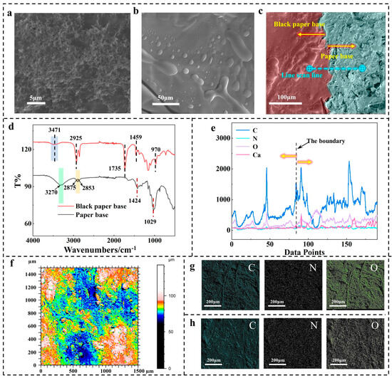 In the SEM test, the accelerated voltage (EHT) of the paper-based membrane measurement is set to 5 KV, and the accelerated voltage of cooked tung oil is set to 20 KV. The working distance (WD) between them is between around 6.7 mm and 7.2 mm, and the magnification depends on the presentation state of different samples. In the EDS test, the Amp time is 3.84 μs, magnification (Mag) is set to 250 and EHT is set to 20 KV. Figure 2a,b show the SEM analysis of water-soluble high-pigment carbon black and cooked tung oil. The carbon black powder aggregates, and the particles are aggregated. This characteristic means there is a good effect in the coloring stage of the paper-based film. Looking at Figure 2b, there are some bubbles on the surface of cooked tung oil. After the surface of the sample is brushed and dried, the air inside the bubbles is released during the drying process. Therefore, during the curing process, the cooked tung oil will form a rough surface structure of the black paper base film, as shown in Figure 2f. Figure 2c,e characterize the cross-section of the black paper base film by SEM and EDS. The left side of the section boundary is black paper base, and the right side is base paper base. With the dividing line as the center line, the left and right collinear length are swept by 950 mm. Figure 2e shows the surface element changes of different paper base surfaces. On both sides of the dividing line, compared with the black paper covered with oil film, the base paper on the right side has a larger change range of the Ca element and a higher change frequency of the C element. According to the differences between two kinds of paper-based film elements and the distribution of C, O and N in Figure 2e,g,h, the production process for a black paper-based film coated with an oil film is feasible. Figure 2d is a two-dimensional Fourier-transform infrared spectrum analysis of base paper and black paper. The FT–IR recording range was 4000 to 1000 cm−1 with a resolution of 2 cm−1. In the base paper, there is a characteristic peak of stretching vibration of the –OH-associated group in the infrared spectrum near 3270 cm−1, and there is a broad peak of the symmetric stretching vibration of –CH3 and –CH2 groups between 2853 cm−1 and 2875 cm−1. There is a strong absorption peak of –C–O–C and C–OH at 1029 cm−1. There is a characteristic peak of –CH2– antisymmetric stretching vibration at 2925 cm−1. There are –CH3, –CH2– antisymmetric stretching and symmetric bending vibration peaks near 1459 cm−1. There is a characteristic peak of –CO– (lipid) expansion at 1735 cm−1. The disappearance of the characteristic peak of the −OH group on the surface of the black paper base membrane indicates that the cooked tung oil is completely covered on the surface of the black paper base membrane, and the existence of fatty groups further proves that the cooked tung oil is closely attached to the surface of the black paper base film.