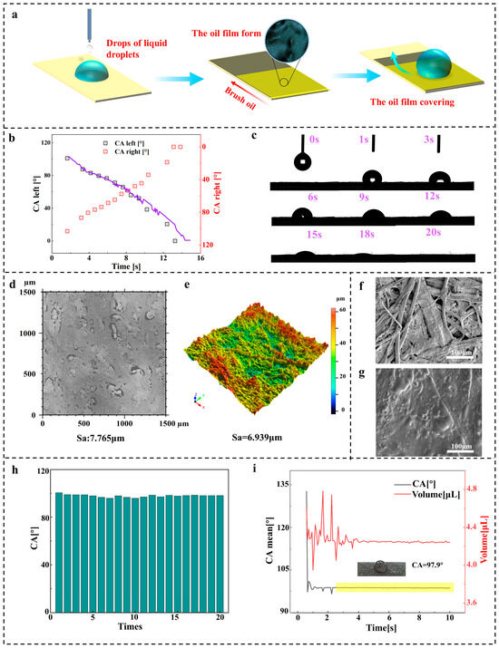 A contact angle weighing instrument was used to test the hydrophobicity of the base paper and black paper base films. In this study, the static contact angle is used to evaluate the hydrophobic properties of paper-based films. The steps are as follows: Cut the paper base to a width of 1 cm and place it on a glass slide. Measure the static contact angle. Select five points randomly on the surface of the paper base. Drop 4 μL of deionized water on the surface of the paper-based sample. The change characteristics of the static contact angle were measured. Figure 4a shows the manufacturing process of the black paper base film coated with cooked tung oil. Brush coating of the cooked tung oil on the surface of the base paper is equivalent to a protective layer, which makes the hydrophilic paper base film transition to a hydrophobic black paper base film. Figure 4b,c show that the surface of the base film of base paper is extremely hydrophilic. In the static contact angle test, when the liquid drops are on the film surface of the base paper, they gradually wet the base paper. As can be seen from Figure 4c, within 20 s, the droplet volume gradually decreases, and the paper fibers absorb water and expand. Finally, the base paper is completely soaked by liquid droplets. Figure 4h,I show that, after the water droplets are dropped onto the surface of the black paper base film, the contact angle is stable around 97.9° (>90°), showing hydrophobicity. The water drops are still on the surface, and the black paper base is not soaked, keeping its original state.