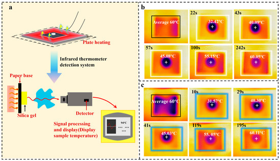 The thermal conductivity of a black paper-based film was studied. The sample of the paper-based film was used as a medium at room temperature. We heated the heating plate (self-made in the laboratory) to 60 °C. The paper sample was cut to 5 cm × 5 cm and placed on the heating plate, and we monitored the heating process of the paper surface with an infrared thermal imager. Due to the low thickness of the paper film itself, it is difficult to grasp its temperature change in time. A small amount of cylindrical silica gel was placed on the paper base, and the time of its temperature rise to 60 °C was monitored using an infrared thermal imager; then, the heat transfer effects of different paper-based films were compared. Figure 5a shows that, after the heating plate is heated to 60 °C, the paper-based sample is placed. When the thermometer detects that the surface temperature of the paper-based sample reaches 60 °C, place a silica gel block to monitor its temperature change. Figure 5b shows that when the silica gel block on the surface of the base paper is initially placed, the temperature is 32.42 °C, and the time point is 22 s. After that, the time points of the silica gel block at about 40 °C, 45 °C, 55 °C and 60 °C were recorded, and the heat transfer rate was calculated. When the base paper is the heat transfer medium, the time for the silica gel block to rise to 45.08 °C and 60.05 °C is 35 s and 220 s, respectively. The heat transfer rates are 36.17 °C/s and 12.6 °C/s, respectively. Obviously, the temperature rise rate decreases in the stage of 45 °C~60 °C