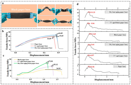 In Figure 6a, the black paper base film is bent upwards and downwards and twisted clockwise and counterclockwise to simulate the actual use and destruction scene on farmland. Finally, the macroscopic surface of the black paper base film remains the same. Figure 6b–d show the mechanical test for the base paper and black paper base film after ultraviolet and dry heat aging. After ultraviolet-light aging, the mechanical strength of the base paper decreased slightly. Compared with the base paper without ultraviolet aging, the maximum tensile and tearing forces of the base paper have a downward trend. On the contrary, the maximum tensile stress of the black paper-based film increased by 57.8% after ultraviolet aging. Under the irradiation of ultraviolet light, the ultraviolet light directly shines on the surface of the paper mulch film, destroying the paper fiber structure and breaking the molecular chemical bond, which leads to a significant decline in the mechanical properties of the base paper after ultraviolet aging.
