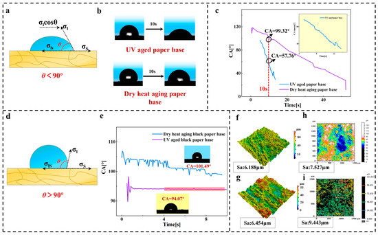 (a) Hydrophilic (CA < 90°) model; (b) hydrophilic infiltration process of base film of base paper after ultraviolet and dry heat aging; (c) contact angle curve of the base film of the base paper after ultraviolet and dry heat aging; (d) hydrophobic (CA > 90°) model; (e) contact angle of black paper base film after ultraviolet and dry heat aging (the red line highlights the stability of the contact angle value); (f,g) three-dimensional morphology of base film surface of base paper after ultraviolet and dry heat aging; (h,i) contour lines of black paper base film surface after ultraviolet and dry heat aging.