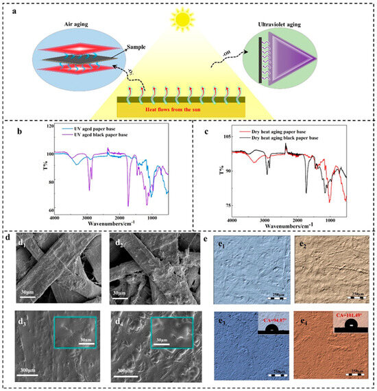 Analysis of weather resistance mechanism of paper base film. (a) Ultraviolet and dry heat aging experimental model; (b) infrared spectra of base paper and black paper base film after ultraviolet aging; (c) infrared spectra of base paper and black paper base film after dry heat aging; (d) SEM of base paper and black paper after UV and dry heat aging ((d1,d3) UV aging base paper and black paper base film, (d2,d4) dry heat aging base paper and black paper base film); (e) photo simulation of the surface of base paper and black paper after ultraviolet and dry heat aging ((e1,e3) ultraviolet aging base paper and black paper base film, (e2,e4) dry heat aging base paper and black paper base film).