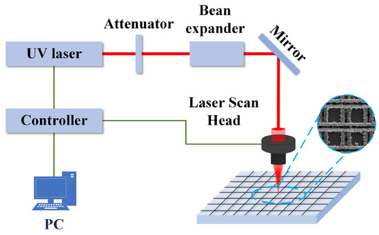 As shown in Figure 1, the proposed laser–chemical treatment consisted of two steps, i.e., (1) surface structuring using laser and (2) stearic acid immersion. In surface structuring, the laser was produced by the laser marking machine (MQ5T, Mac Laser, Guangzhou, China); it was equipped with a 355 nm UV laser source (Seal-355-3/5, JPT Laser, Shenzhen, China). The UV laser source emitted a laser beam, which passed through the attenuator and beam expander to control the intensity and diameter of laser, respectively. The laser scan head was used to control and modulate the laser beam, which allowed us to structure a two-dimensional surface. The diameter of a focal spot was 50 µm. A cross-hatch surface pattern was adopted to structure surfaces using laser. In Table 2, the key processing parameters of laser surface treatment are listed. This work emphasized the effect of scanning speed and step size on the anti-corrosion and antibacterial properties of treated specimens.