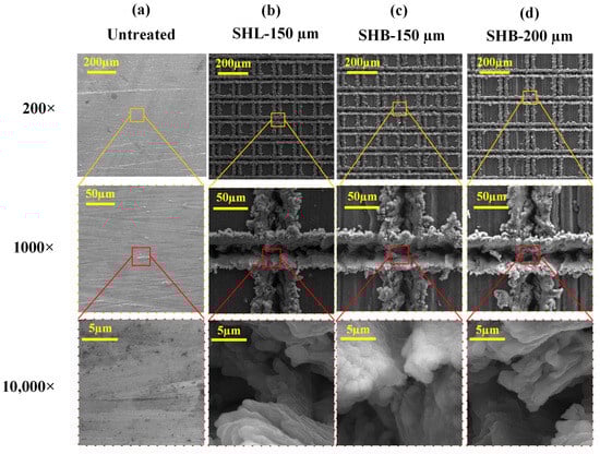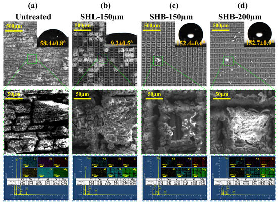 SEM micrographs, EDS spectra, and wettability for specimens after laser–chemical surface treatment: (a) untreated; (b) SHL-150 µm; (c) SHB-150 µm; (d) SHB-200 µm.