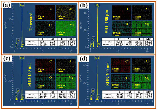 EDS analyses of four specimens: (a) untreated; (b) SHL-150 µm; (c) SHB-150 µm; (d) SHB-200 µm.