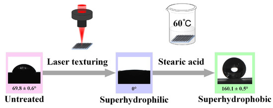 When a specimen was only treated with laser surface structuring, it typically exhibited superhydrophilicity. To achieve the wettability transition, the laser structured specimen was further immersed in mixed stearic acid (CH3(CH2)16COOH with density of 0.9408 g/cm3 and melting point of 69.3 °C)/ethanol (CH3CH2OH) solution at 60 °C with a molar concentration of 0.05 mol/L and a molar ratio of 1:350 for 10 min. The specimen was then cleaned with ethanol to remove excessive stearic acid and dried in ambient air to determine surface properties.