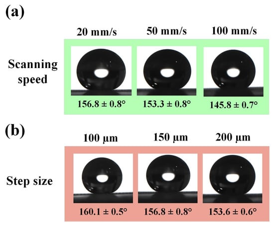 As shown in Table 2, when the scanning speed was changed, the step size was kept constant at 150 µm; in turn, when the step size was changed, the scanning speed was kept constant at 20 mm/s. Figure 5 illustrates the WCA of the laser–chemical-treated specimens that were processed at different scanning speeds and step sizes. Figure 5a shows that at a scanning speed of 20 or 50 mm/s, the surface of the laser–chemical-treated specimen exhibited distinct superhydrophobicity; when the scanning speed rose to 100 mm/s, the WCA dropped to slightly below 150°, but it still maintained high hydrophobicity. The main reason for this result was that a high scanning speed lowered the time of laser–material interaction and thus weakened the density of surface micro/nanostructures, as shown in Figure S2, leading to a slight decrease in the WCA. For step sizes from 100 to 200 µm that were tested here, the superhydrophobicity was stabilized, and a wide scope of effective processing variables in the laser–chemical treatment is depicted in Figure 5b. The results show clearly that laser processing parameters could be selected to modulate and control the wettability of the surface appropriately.