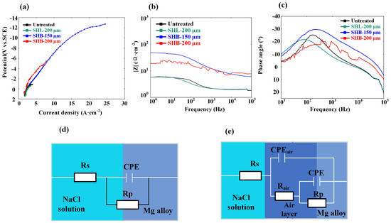 Figure 7a–c show the EIS spectra of specimens. The Nyquist plots in Figure 7a show that the semi-circle diameter of the capacitive loop of SHB-150 µm and SHB-200 µm was larger than that of the untreated specimen; however, the diameter of SHL-150 µm was smaller than that of the untreated specimen. The results are consistent with the comparison of the OCP and PDP curves, which show that the corrosion resistance was improved in SHB-150 µm and SHB-200 µm but worsened in SHL-150 µm [47,48]. The Bode impedance plots in Figure 7b show that the impedance value (|Z|) of SHB-150 µm and SHB-200 µm Mg alloy was higher than that of the untreated specimen. The Bode phase plots in Figure 7c illustrate that the phase angle of SHB-150 µm and SHB-200 µm was higher than that of untreated specimens at a high-frequency range of over 1000 Hz. Higher |Z| values and phase angles indicate the significant enhancement in the corrosion resistance created by the proposed laser–chemical surface treatment [50,51].