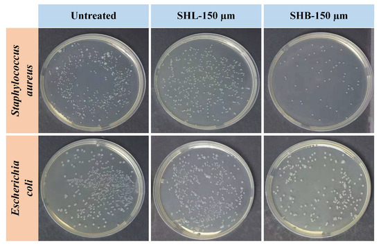 Figure 10 shows high-resolution images of bacteria colonies of specimens cultured for 24 h. The antibacterial performance was evaluated by the number of bacteria colonies. A large number of E. coli and S. aureus colonies were observed on the untreated specimen, indicating its poor antibacterial performance. Immediately after the surface was structured by a laser, the numbers of E. coli and S. aureus colonies of SHL-150 µm increased slightly. This indicated that the laser structuring on the surface with superhydrophilicity did not change its antibacterial performance effectively. However, the numbers of E. coli and S. aureus colonies of SHB-150 µm in the laser–chemical surface treatment were reduced significantly, which proved that the proposed laser–chemical surface treatment improved the antibacterial performance remarkably.