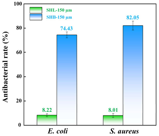 Equation (1) was used to calculate the antibacterial rate of the laser-structured and laser–chemical-treated specimens based on China’s standard GB/T 2591 [56], as shown in Figure 11. The antibacterial rate of E. coli in SHL-150 µm was merely 8.22%, while it increased greatly to 74.43% in SHB-150 µm. The antibacterial rates of S. aureus in SHL-150 µm and SHB-150 µm were 8.01% and 82.05%, respectively. The big difference in antibacterial rates in these specimens showed that the laser–chemical surface treatment induced superhydrophobicity and improved the antibacterial performance of Mg alloy significantly [36,37].