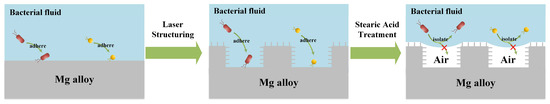- The proposed laser–chemical surface treatment also strengthened the antibacterial performance of the Mg alloy specimen greatly, and the antibacterial rate was as high as 82.05%, mainly owing to the air pockets in the structured surface restraining the penetration of bacterial fluid.