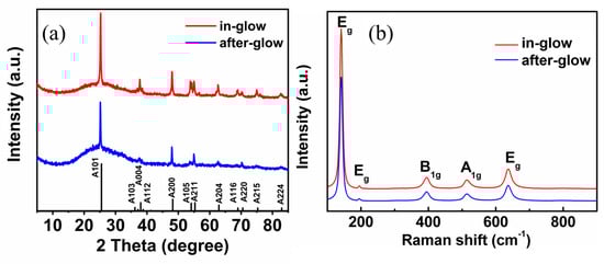 (a) XRD, and (b) Raman spectra of TiO2 thin films deposited in in-glow and after-glow.