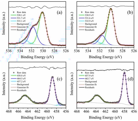 (a,b) represent the resolved peaks of O 1s spectrum, and (c,d) represent the Ti 2p spectrum of the films obtained in the in-glow zone and in the afterglow zone, respectively.