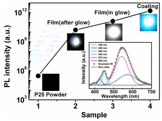 The PL intensity of (1) the P25 powder, (2) the after-glow film, (3) the in-glow film, and (4) the commercial fluorescent coating, as well as the PL spectrum (inset), of the in-glow film.