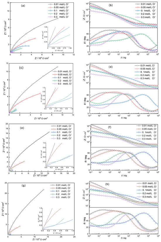 SEM microscopic morphology of P110 casing steel after 10 d of immersion in different environments: (a,b) 0.01 mol/L Cl−, (c,d) 0.1 mol/L Cl−, (e,f) 0.3 mol/L Cl−, (g,h) annulus fluid.