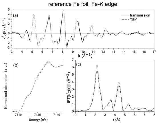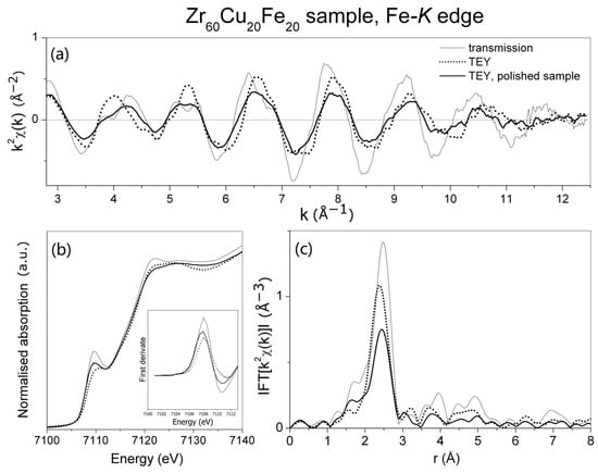 The TEY from the pre-annealed sample, when compared to transmission, exhibited a slight shift in the Fe-K absorption edge toward higher energies (blue shift) (Figure 2b), a reduced intensity of the pre-peak at 7108 eV, and different post-edge features. These differences were attributed to the presence of an oxide layer on the sample surface, where the chemical and geometrical environment of Fe atoms differed from the bulk. To verify this assumption, the sample surface was polished using fine sandpaper, and XAFS spectra were re-measured. The onset of the absorption edge coincides with the transmission result, and the pre-peak increases significantly, but the post-edge structure remains distinct. The “blue shift” is caused by the loss of electrons from Fe atoms due to the presence of an oxide bond. This shift is not large, but it is important to keep in mind that the oxide layer is very thin.