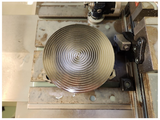 The tests were performed using an HAAS VF-2 CNC machining center (HAAS Automation, Oxnard, CA, USA). The maximum speed the equipment reaches is 10,000 rpm, and its maximum power is 20 kW. As INCONEL® 718 was supplied as a cylindrical bar, the best strategy to use was spiral milling, which starts in the center of the workpiece towards its periphery, avoiding a previous partial lateral contact of the tool with the external skin of the round bar. Figure 1 shows the machined workpiece and the spiral marks on its surface.