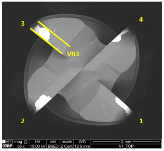 According to ISO 8688-2:1986 [69], the wear phenomenon with the greatest influence must be considered as a life criterion. Therefore, VB3 was selected to analyze and check the wear of the cutting tools, as it was located close to the chamfer. In addition, wear measurements were performed in “Position 1”. The top view, rake face, and clearance face of the cutting tools were analyzed. Furthermore, with the EDS analysis, it was possible to confirm that material from the workpiece adhered to the tool. To facilitate identification, the tool teeth were numbered from 1 to 4, as shown in Figure 2, which also illustrates how the VB3 measurement was carried out.