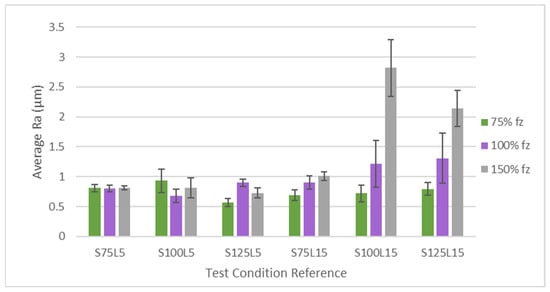 Regarding the feed per tooth, under condition S75L5, no significant influence was observed since the values were similar when changing this parameter. In turn, under condition S100L5, roughness decreased when increasing from 75% to 100%, followed by a slight increase when increasing feed per tooth to 150%. For condition S125L5, the opposite of the previous conditions occurred. In this case, there was an increase in roughness when increasing feed per tooth from 75% to 100%, followed by a slight decrease when increasing this parameter to 150%. On the other hand, in all conditions with 15 m cutting length, the trend was clearer, with an increase in surface roughness when increasing the feed per tooth.