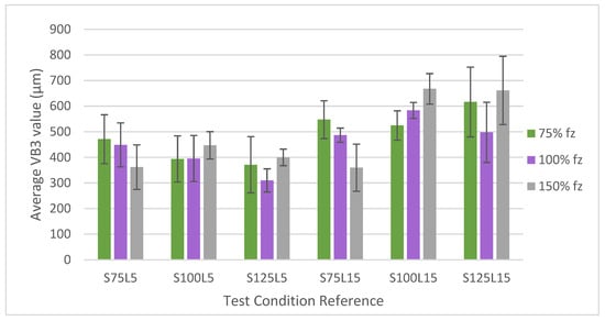 Regarding the feed per tooth, a single trend was not observed for all tools, and its influence was more difficult to detect. For example, for conditions S75L5 and S75L15, flank wear decreased with the increase in feed per tooth, whereas in conditions S100L5 and S100L15, flank wear increased with the increase in feed per tooth. On the other hand, in conditions S125L5 and S125L15, flank wear was reduced when increasing from 75% to 100% feed per tooth, followed by an increase when increasing to 150%, resulting in higher wear than in the situation of 75% feed per tooth. It is interesting to note that the behavior was the same for each analysis group regarding cutting speed.