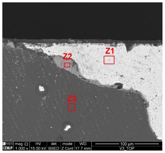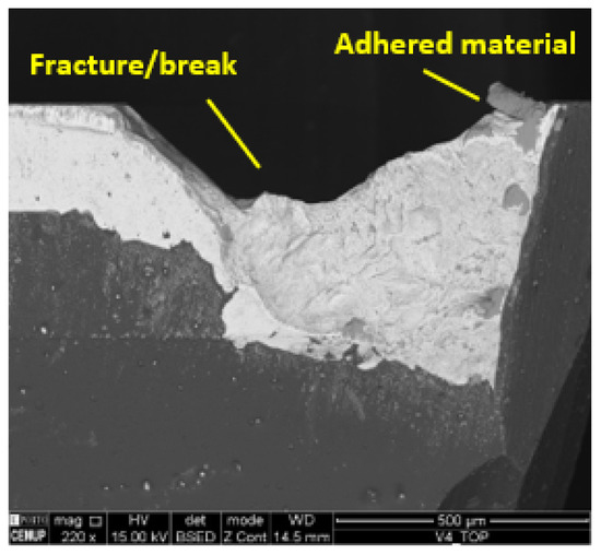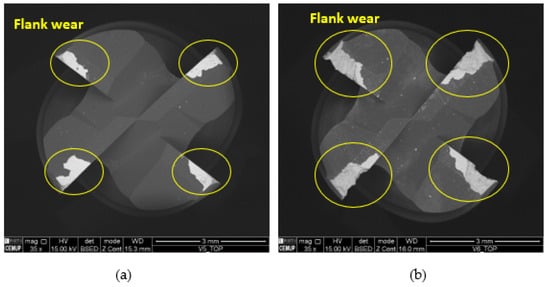 The tool wear analysis was evaluated using SEM equipment, according to the ISO 8688-2:1986 [69]. For this, an FEI QUANTA 400 FEG scanning electron microscope was used (FEI, Hillsboro, OR, USA), equipped with an EDAX Genesys Energy Dispersive X-Ray Spectroscopy (EDAX Inc., Mahwah, NJ, USA) microanalysis system. For the analysis, BSE (Backscattered Secondary Electron) mode was used at magnifications between 40× and 2000×. For EDS, a beam potential of 15 kV was used, which was sporadically reduced to 10 kV, avoiding interference of the substrate in the analysis.