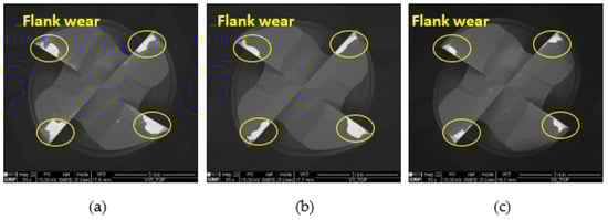As for cutting speed, usually an increase in this parameter results in a smoother cutting behavior by the cutting tools [73]. However, under the conditions analyzed, no clear trend was observed. In conditions F75L5 and F100L5, wear decreased when cutting speed increased. In the case of conditions F150L5, F100L15, and F150L15, wear increased when increasing the cutting speed from 75 m/min to 100 m/min, followed by a decrease in wear when increasing to 125 m/min. In turn, in condition F75L5, flank wear decreased with increasing cutting speed from 75 m/min to 100 m/min and increased when increasing the speed to 125 m/min. This is not commonly observed and may be related to the adhesion of material to the surface of the coating, creating more abrasion and leading to its delamination [83]. Figure 6 illustrates the tools used under condition F100L5, in which with increasing cutting speed, flank wear decreased. Based on this, condition S125F100L5 proved to be the optimal parameter with regard to maximum wear VB3, as this had the lowest value in addition to being at higher speed and intermediate feed per tooth, which makes them great parameters for minimizing wear and maintaining high performance and productivity.
