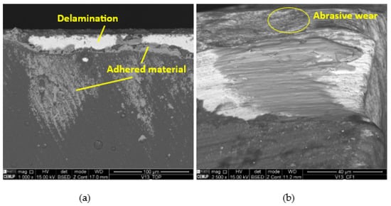 Condition S75F75L5: (a) delamination and adhered material at 1000× magnification and (b) abrasive wear at 2500× magnification.
