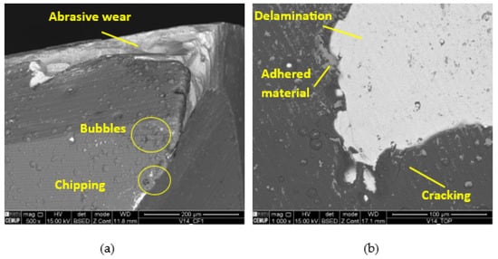 In the case of conditions S75F100L5 and S75F100L15, abrasive wear and coating delamination were of high intensity in the second. Figure 9 illustrates these two conditions, with Figure 9a referring to abrasive wear, bubbles, and adhered material in condition S75F100L5, and Figure 9b presenting the delamination, adhered material, bubbles, and cracking in condition S75F100L15. The presence of cracks can be justified by the fact that the coating does not exhibit crack propagation resistance enough to avoid this phenomenon, as it is a monolayered coating [88]. Typically, multilayer or nanostructured coatings have greater resistance to crack propagation due to the adhesion layer in contact with the tool substrate and the successive interfaces between layers, which tend to block crack propagation [18].
