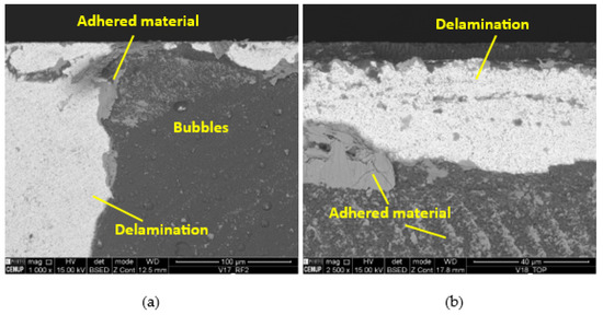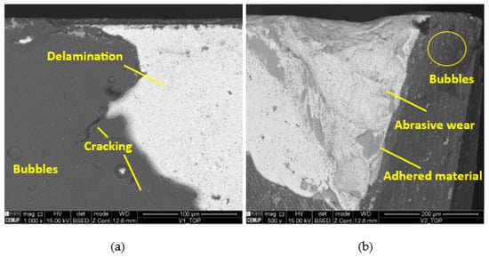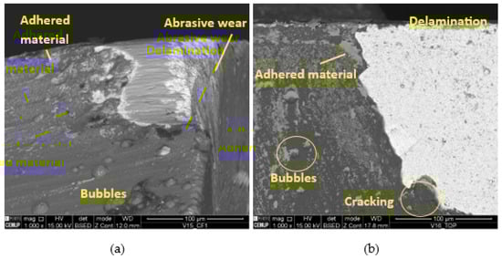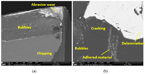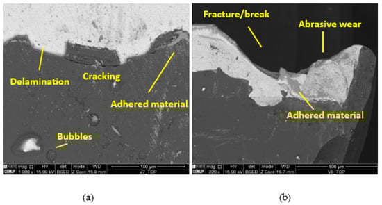 Condition S75F75L15: (a) abrasive wear, bubbles, and chipping at 500× magnification and (b) delamination, adhered material, and cracking at 1000× magnification.