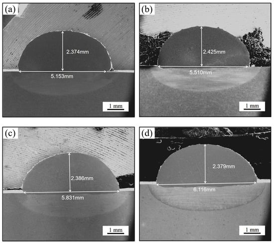 Figure 4 shows the macroscopic morphology of cross-sections of single-pass laser cladding layers prepared with different laser powers. It can be seen that the cross-sections of the laser cladding layers are of good quality without porosity defects. Moreover, the laser cladding layers have great metallurgical bonds with the substrate.