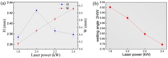 Figure 5a shows the variation in the height and width of the laser cladding layer at different laser powers. The height, width, and dilution rate of the laser cladding layer are important factors used to evaluate the macro quality of the laser cladding layer. The width and height of the laser cladding layer mainly affect the preparation efficiency of the laser cladding layer and the size of the wetting angle [