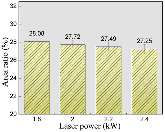 Figure 9 shows the area proportions of the carbides in the laser cladding layers prepared with different laser powers. According to the statistics, with the increase in laser power, the proportion of the carbide area in the laser cladding layer gradually decreased. The main reason is that the laser heat input increased and some Cr elements entered the matrix, reducing the carbide content in the laser cladding layer.