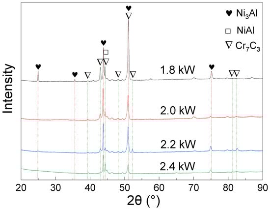 3. The different peak values of the diffraction peaks of each phase under different power conditions are caused by the growth of grains along different crystal planes and different orientations. Compared with the standard PDF card, the positions of the γ′-Ni