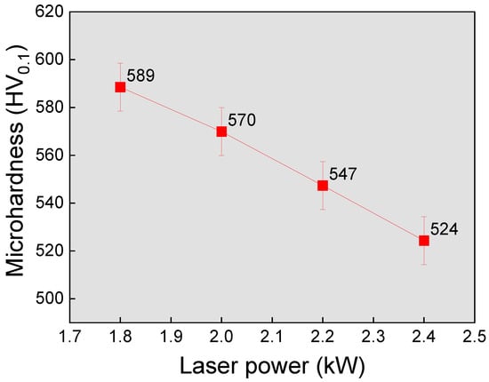Figure 12. The hardness gradually decreased with the increase in laser power. The main reason was that with the increase in laser power, the heat input of the laser cladding layer increased, the solid solution of Cr was enhanced, and the hardness of the cladding layer should have been increased. However, the increase in the heat input increased the dilution rate, more Cr penetrated the substrate material, and the proportion of the strengthening phase Cr