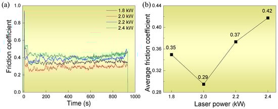 Figure 13b shows the relationship between the average friction coefficient of the laser cladding layer sample and the laser power in the stable stage. It can be seen that when the laser power was 1.8 kW, the average friction coefficient was 0.35. When the laser power was 2.0 kW, the average friction coefficient reached a minimum of 0.29. When the laser power was 2.4 kW, the average friction coefficient increased to about 0.42, which was relatively high. With the increase in laser power, the average friction coefficient curve of the laser cladding layer showed a trend of first decreasing and then increasing, and the turning point was when the laser power was 2 kW. According to this phenomenon, we believe that the friction and wear mechanism between the friction materials changes [