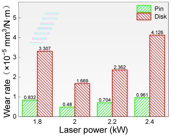 Figure 14 shows the wear rates of the laser cladding layer samples and the grinding disks under different laser power conditions. It can be found that the wear rates of the cladding layer samples after the friction and wear test were much less than that of the grinding disks. With an increase in laser power, the wear rates of the cladding layer samples and the grinding disks changed in the same trend. When the laser power was 1.8 kW, the wear rate of the laser cladding layer was 0.832 × 10