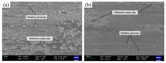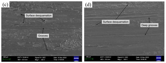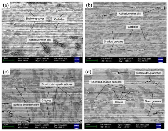 Figure 16 shows the wear surface morphology of laser cladding layers at different laser powers captured via backscattering imaging. Due to the cyclic action of the friction shear force on the wear pair for a long time during the process of friction, the surface of the laser cladding layer forms a reinforced layer of a certain thickness. Due to the process of friction and wear, the reinforced layer cracks and gradually falls off under the action of shear stress and abrasive impact, forming hard abrasive particles. According to the wear morphology shown in