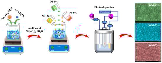 Ni-doped WO3 (W-Ni) thin films were synthesized utilizing a simple electrodeposition method. A 15 mM solution of Na2WO4·2H2O was synthesized in 100 mL of deionized (DI) water. Afterward, the addition of 0.5 mL of 30% H2O2 took place to produce a bright, yellow-colored solution. Then, HNO3 was added while the mixture was heated to 45 °C. A further step involved bringing the resulting peroxo-tungstic acid (PTA) solution to room temperature [9]. Pre-cleaned FTO substrates were subjected to electrochemical deposition, and varied concentrations of Ni doping (1, 3, 5 wt. %; designated as WNi-1%, WNi-3%, and WNi-5%, respectively) were added to produce distinct compositions. This work examined the effects of different Ni doping levels on the structure, composition, and EC characteristics of the material. Figure 1 displays a detailed schematic depiction of the W-Ni synthesis process.