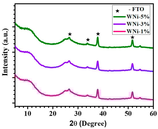 X-ray diffraction (XRD) was employed to scrutinize the structural attributes of W-Ni thin films. All of the W-Ni thin films showed an amorphous structure, as illustrated in Figure 2, where discernible peaks representative of the FTO substrate were evident across all samples. Within the lower 2θ range, approximately at 26° 2θ, a broad hump was identified, signifying the amorphous nature of WO3. The non-appearance of supplementary diffraction peaks attributed to WO3 implied the presence of an amorphous nature within the films [9,24]. Despite a uniform XRD pattern orientation observed in all samples, a subtle discrepancy in the intensity of the noted hump was observed. This consistency in XRD pattern orientation suggested homogeneity in the structural attributes among the W-Ni thin films. No peaks corresponding to Ni were detected for any W-Ni thin film [25,26]. Amorphous WO3 thin films are commonly favored for electrochromic applications. Their suitability arises from their tightly packed and highly crystalline structure, which hinders ion diffusion, thereby leading to a slower response time. In contrast, the amorphous WO3 coating exhibits rapid switching kinetics and substantial optical modulation due to its loosely packed crystal structure and ample specific surface area [27,28].