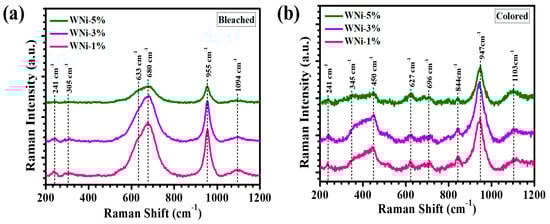 W-Ni thin films present a compelling avenue for electrochromic applications, and the investigation of their bleached and colored states through Raman spectroscopy yields valuable insights into their structural transformations. Figure 3a illustrates the Raman spectra acquired in the bleached state across different concentrations of Ni dopants (WNi-1%, WNi-3%, and WNi-5%). Within the spectral range, two distinct peaks at 241 cm−1 and 305 cm−1 are traced, corresponding to the angular vibration modes of O-W-O interactions [29,30]. The characteristic attribute of amorphous WO3 is shown through broadened peaks centered at 633–680 cm−1 and 955 cm−1, originating from the stretching vibrations associated with W=O and W-O modes, respectively [31]. The supplementary band identified within the 1094 cm−1 range is attributed to the FTO substrates [32]. Figure 3a reveals an absence of Raman bands associated with impurities. A subtle shift in peak position, coupled with a decrease in peak intensity, was observed in correlation with the increase in the Ni dopant concentration. This phenomenon may be explained by the probable creation of structural surface imperfections caused by the introduction of the foreign element (Ni) [30,32]. These observations contribute to an understanding of the structural dynamics and interaction modes present in W-Ni thin films during their bleached state, paving the way for comprehensive electrochromic assessments.