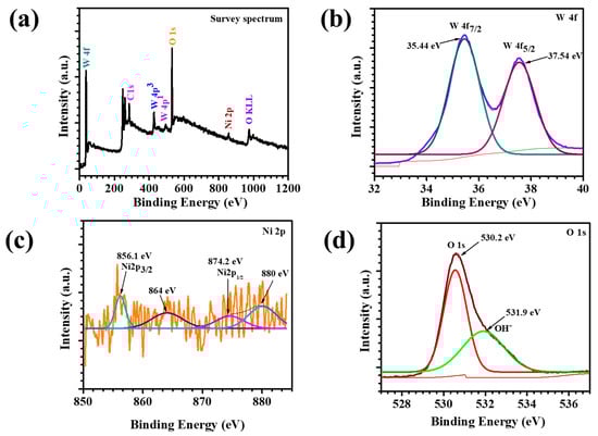 X-ray photoelectron spectroscopy (XPS) was applied to ascertain the presence of the targeted elements and elucidate their specific valence states within the synthesized material. As depicted in Figure 4a, the survey spectrum of the WNi-3% sample clearly confirms the existence of W, Ni, and O elements, along with discernible peak attributed to residual carbon originating from environmental sources. The distinctive peaks corresponding to W, Ni, and O in the survey spectrum serve as elemental indicators, supporting the successful electrodeposition of the W-Ni thin film. A more detailed examination of the core-level XPS spectra for W4f, presented in Figure 4b, unveils two prominent peaks positioned at 35.44 eV and 37.54 eV, corresponding to the W4f7/2 and W4f5/2 orbitals, respectively. The identification of these peaks at their respective energy levels conclusively establishes the predominant valence state of W as W6+, affirming the tungsten’s state in WO3 [36]. The Ni2p XPS spectra for WNi-3% are illustrated in Figure 4c, revealing a spectrum characterized by irregular noise peaks, in which broad main and satellite peaks were detected. The primary peak at a binding energy of 856.1 eV corresponds to Ni2p3/2, while the peak at 864 eV is associated with its satellite peak. Another significant peak at 874.2 eV represents Ni2p1/2, with its corresponding satellite peak situated at 880 eV [37]. The difference in binding energy between the principal peaks of Ni2p3/2 and Ni2p1/2, approximately 18.1 eV, precisely aligns with the reported data for Ni, providing compelling evidence for the successful integration of Ni ions into the host matrix of WO3 nanogranules in the form of Ni2+ [36]. Additionally, the O1s spectra depicted in Figure 4d exhibit a prominent peak centered at 530.2 eV, attributed to metal–oxygen bonds in the oxidation state of O2+. A supplementary shoulder peak at 531.9 eV indicates the presence of hydroxyl groups (OH−) [38].