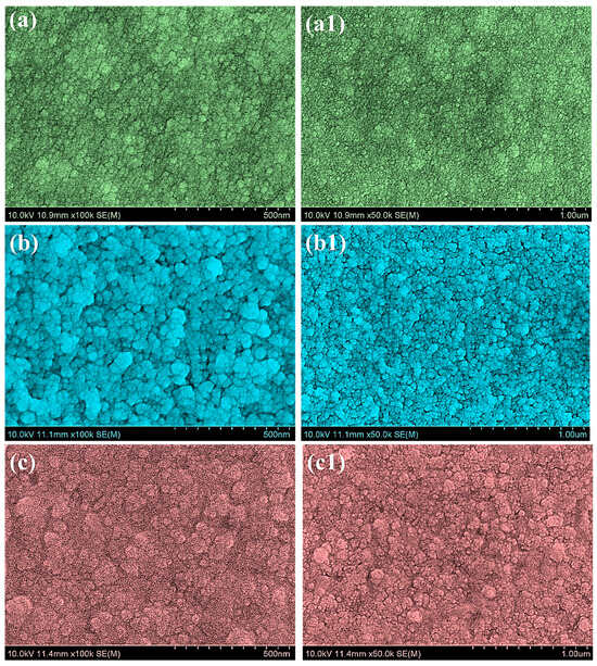 FE-SEM images of (a,a1) WNi-1%, (b,b1) WNi-3%, and (c,c1) WNi-5%, thin films.