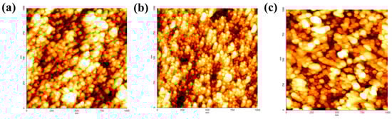 AFM images of W-Ni thin films (a) WNi-1%, (b) WNi-3%, and (c) WNi-5%.