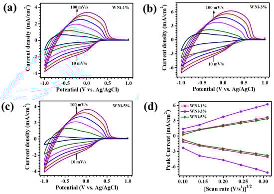 Cyclic voltammetry of (a) WNi-1%, (b) WNi-3% (c) WNi-5% thin films at different scan rates (10–100 mV/s), and (d) Plot of peak current vs. (scan rate)1/2 of all samples for the diffusion coefficient.