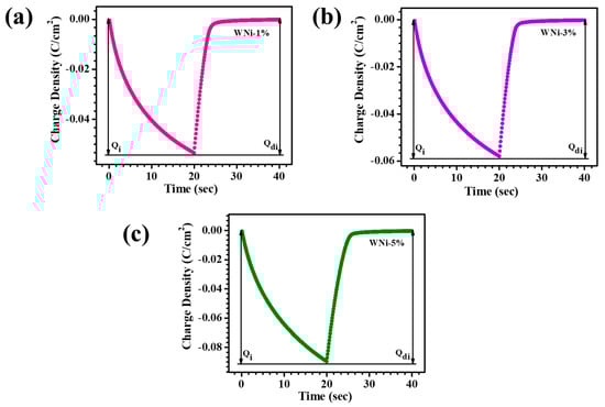 Quantitative evaluation of the Li+ intercalation/deintercalation dynamics from the N-W electrodes over time was achieved by chronocoulometry (CC) analysis. Figure 8a–c illustrates the CC plots for WNi-1%, WNi-3%, and WNi-5%, respectively, conducted in a 1M LiClO4 + PC electrolyte. Cathodic polarization involves the introduction of charges into the material, leading to the reduction of W6+ to W5+ and the consequent transition of the film to a colored state. Next, the reverse potential induces the deintercalation of electrolytic ions, resulting in the oxidation of the host material back to W6+. The reversibility of an electrochromic material is a pivotal parameter, influenced by the ratio of charges deintercalated (Qdi) to the number of charges intercalated (Qi), expressed as follows [12]: