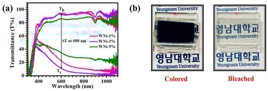 Combined optical transmittance spectrum of (a) WNi-1%, WNi-3%, and WNi-5% thin films at the colored and bleached states from 300 to 1100 nm range over potential window ± 1 vs. Ag/AgCl and (b) digital photographs of a 4 × 3 cm2 EC device for WNi-3% sample in both its colored and bleached states.