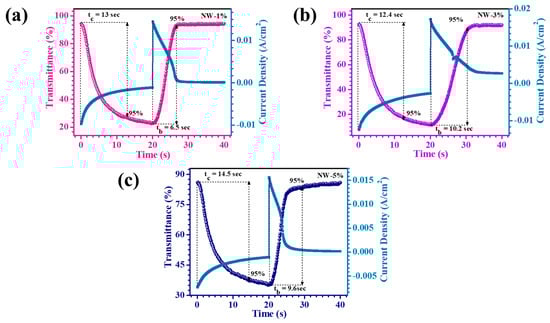 The coloration and bleaching time of electrochromic films are pivotal parameters that directly influence their performance and practical applicability. The coloration time represents the duration required for the electrochromic material to achieve its colored state, while the bleaching time denotes the time taken for the material to return to its initial, transparent state. Optimizing coloration and bleaching times is crucial for enhancing the real-world usability of electrochromic films in applications ranging from smart windows to display technologies, ensuring timely and efficient modulation of optical properties for desired functionalities. Herein, Figure 10a–c displays the optical switching analysis with the help of an in situ transmittance cycle together with a CA graph. The switching time (described as the time required to achieve 95% of the optical contrast) and the calculated coloration time (tc) and bleaching time (tb) for W-Ni thin films are listed in Table 1. The WNi-3% electrode had a shorter coloring time of 12.4 s compared to the other electrodes. Bleaching time exhibited a significantly longer duration. Overall, the WNi-3% electrode has exceptional electrochromic performance in all aspects and is well suited for practical use.