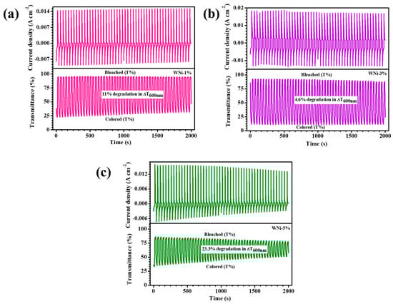 In the realm of smart windows, the durability of electrochromic cycling stability is very important. The investigation of the EC characteristic retention capacity of thin films, namely WNi-1%, WNi-3%, and WNi-5%, was conducted using a UV-Vis spectrometer coupled with an EC cyclic tester in a standard three-electrode setup. The in situ transmittance cycles at 600 nm and the cyclic stability of current density (CA) were measured. Figure 11a–c illustrates the W–Ni thin films, and a combined plot of current density and optical stability was observed for each 40 s cycle at 600 nm, transitioning between colored (at −1 V) and bleached (at 1 V) states over 2000 s. During the coloration/bleaching cycle testing, the WNi-3% film demonstrated remarkable stability throughout the entire 2000 s, experiencing only a 4.6% deterioration in ΔT. This enduring performance is attributed to the porous surface morphology, providing structural stability, fewer ion trapping sites, and strong adherence to the substrate. In contrast, both WNi-1% and WNi-5% exhibited optical degradation of 11% and 23.3%, respectively, after the 2000s of electrochromic cycling. The Tb% of W–Ni thin films exhibited a gradual decrease, while the Tc% of all films remained generally steady. The decline in WNi-1% and WNi-5% thin films may be ascribed to significant ion trapping limiting the availability of active sites for ion adsorption and desorption, thereby contributing to the loss of transmittance [9,12,25].
