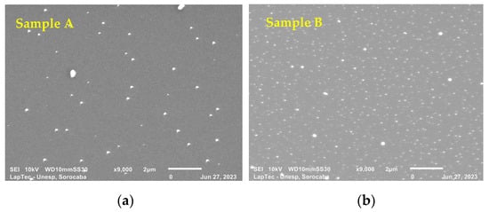 As observed with the aid of a SEM with a magnification of 9000×, the particles showed sizes ranging from 95 to 280 nm. Even smaller particles, however, can easily be detected along the deposited film but cannot be measured owing to the resolution of the equipment. A greater spacing between the particulates is observed in Figure 3a,b. As the exposed area of the Ag target increases, however, a denser grouping of Ag particulates with predominant spherical characteristics is observed (see Figure 3c–e). These results were expected owing to the greater sputtering rate of Ag compared with that of titanium.